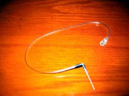 3)把输液管上带有胖肚的部分剪掉,将曲别针扎入输液管头,用曲别针穿过玻璃瓶的橡胶塞子,带着软管穿过瓶塞,穿过的长度也有讲究,盖上塞子时,软管距离瓶底大约1厘米左右。将小针头插到瓶塞子上,作为透气孔使用。