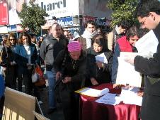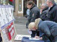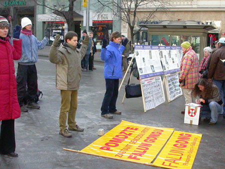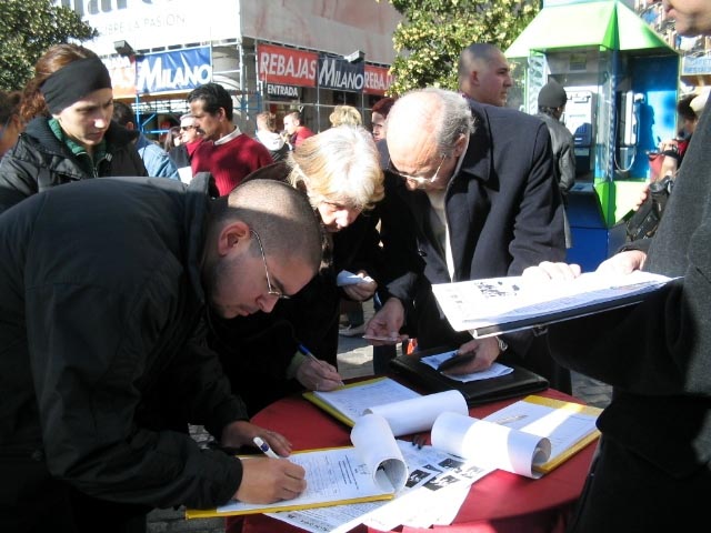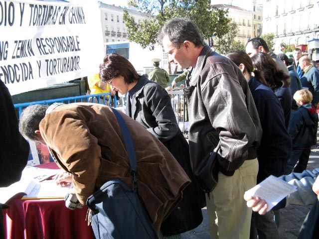 在签字桌前,人们排队等候签字声援法轮功学员、呼吁停止迫害和支持公审江××。一位老先生在自己签字后没有离开,又主动帮助学员发传单并呼吁大家都来签字支持法轮功;有一位女士在了解真象后对学员说,她的工作性质需要她经常去全国各地,她表示会将法轮功真象告诉她在各地的所有的同事和朋友;有几个小伙子开始以为这里是在彩排,看到警察扮演者对着受酷刑的学员扮演者举起警棍,开玩笑的说:“你可别真打呀!”扮演警察的学员告诉他们这里是演示正在中国发生的对法轮功学员的大规模镇压和酷刑迫害,几个小伙子明白后,立即站到了排队签字的队伍中……还有一位先生在听了真象后对学员说,他知道六•四民主运动,知道共产党的独裁专政……。当学员告诉他迫害法轮功的元凶是江××,这位先生说:“这样的人将来结局肯定好不了,祝你们的起诉成功。”