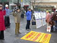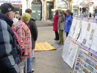 【明慧网2005年1月11日】2005年1月8日(星期六)俄罗斯法轮功学员在莫斯科市中心、塔斯社大楼旁边的广场举行集会,呼吁制止在中国仍在進行着的对法轮功的迫害。学员们用中、俄文打出“真善忍”、“法轮大法好”横幅及大法洪传世界60多个国家的大幅图片,向世人展示法轮大法的美好。同时用中、俄文打出“至今在中国已被迫害致死法轮功学员1266名”,及江氏集团用百种酷刑残酷迫害法轮功学员的多幅图片,揭露江氏流氓集团“群体灭绝”,和“反人类”的种种罪行。学员还用麦克风向来往车辆和过路行人介绍法轮功及中共江氏集团迫害法轮功的真象。