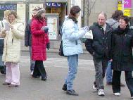学员沿街派发真象报纸,正巧碰上一群家长带着孩子参加节日的庆祝活动,学员们向每个小孩送上了一张贺卡,并把真象报纸递给家长,有的大人不想接,这时小孩高兴的从学员手里接过报纸递给妈妈。多可爱的孩子呀!