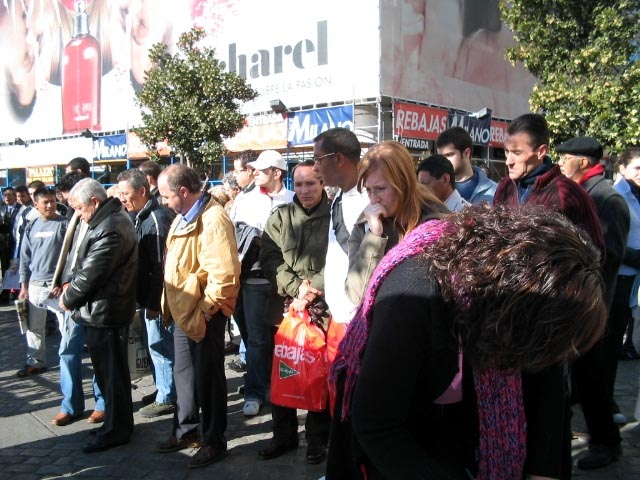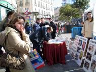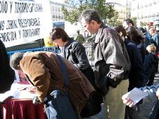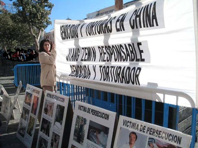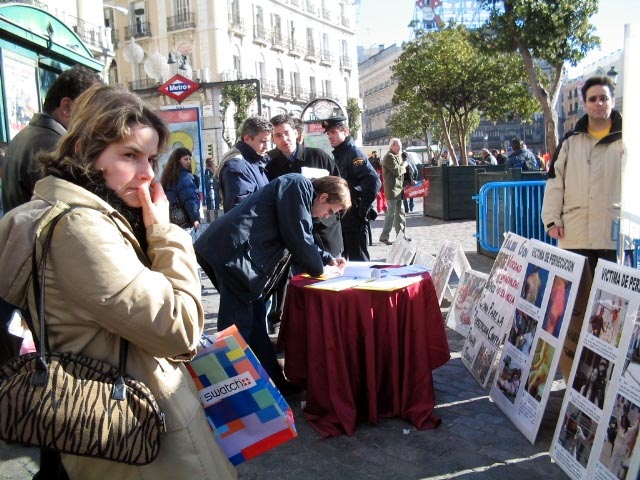 【明慧网2005年1月11日】2005年1月8日,西班牙法轮功学员在马德里市中心的太阳门广场举办真人演示反酷刑展以揭露中共江氏集团在中国对法轮功的残酷迫害。太阳门广场位于马德里正中心,被称为西班牙的心脏部位。从那里分布有十条街道呈太阳光放射状向外延伸;广场上矗立着象征西班牙的标志——熊的雕像和神楼(现在是马德里自治政府所在地),因为这里是四面八方街区的交汇点,所以永远是人声鼎沸、人流如织。