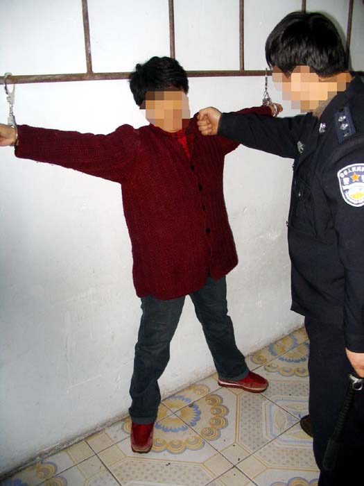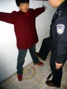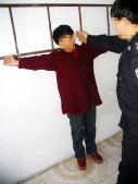 这时天蒙蒙亮了,宋桂芬被挂在墙上,刚挂上一只手,瘦警察冷不防从宋桂芬背后用胶皮棍“呼”地一下子打了下来,还气急败坏地骂:“整死她!把别人写的资料念给她听!”(图9) 然后又把宋桂芬另一只手挂上,用他的脚使劲踩宋桂芬的脚,还用脚踢她的左腿。他们又开始不断的用方便袋套宋桂芬的头、用凉水浇,突然间“咣咣”照她头上几拳,使宋桂芬的头重重地撞在墙上。