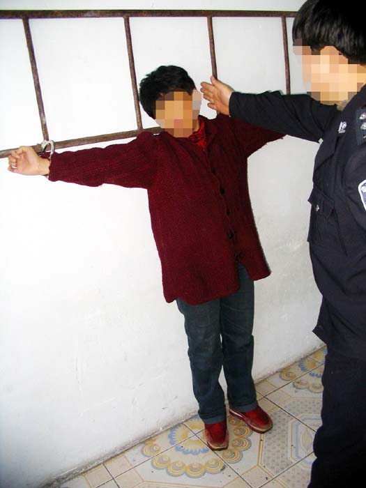 说完后他就到床上休息一会儿,突然他站起来朝宋桂芬小腹猛的踹了一脚,当时她感觉肠子象断了一般。(图4)这时宋桂芬铐在墙上的手疼痛难忍,小腹部位非常痛,而且头昏脑胀。