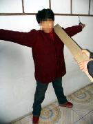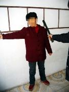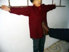 于是又来了一个人帮助白士杰给宋桂芬上刑,把她胳膊伸直、两腿分开达到不可站立的程度,让宋桂芬挺二十分钟。在此期间白士杰用拳头往宋桂芬左肩胛骨猛打无数下,打一阵之后又用脚踢宋桂芬的左腿,(图11)接着又打了宋桂芬一阵耳光,累得他们休息了一会后。 白士杰又来了,他用木方反复的砸宋桂芬的左肩胛骨。(图12)