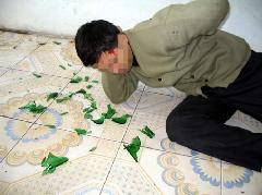 恶警们见他弯下了腰,马上用脚踹他膝盖,他立刻条件反射的直起了腰,但是由于剧痛他马上摔倒在地上,啤酒瓶子摔碎了,把李智泳的头部划破了。