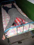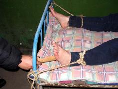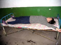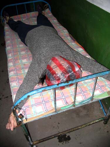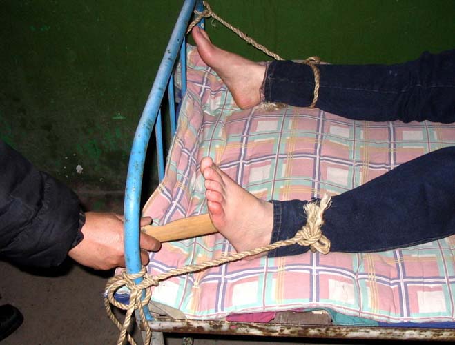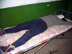 三个恶警开始了又一轮的刑讯逼供,班慧娟一言不发,他们气急败坏的把她绑在床上,把手铐在床上,脚用绳子绑在床上,成“大”字,班慧娟手脚立刻变得黑紫,非常痛苦,一动不能动。(演示图1)
