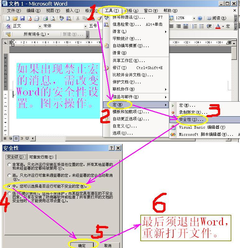 5、如果Word出现禁用宏的消息,可参照压缩包内图片文件图示的操作步骤更改Word设置(改一次即可)。