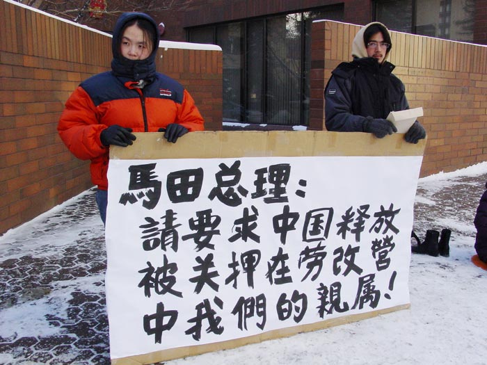 【明慧网2005年1月13日】2005年1月11日中午,加拿大卡尔加里法轮功学员在中领馆前集会,呼吁总理马田在访问中国期间,敦促中国政府停止对法轮功的迫害,并帮助营救被关押在中国劳教所遭受迫害的加拿大华人亲属。