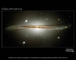 ESO 510-G13结构的细节清晰可见是因为沿着盘形的星际尘埃云在其后自星系明亮,平滑的中心凸出部分发出的光亮照耀下显出了轮廓。