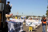 最近一段时间南加州天气异常,连天阴雨,可是游行的前几天,天气突然好起来,游行的当天更是晴空万里。法轮大法的队伍由两个横幅、一个花车、一组反酷刑展和一个展牌方阵组成。走在队伍最前面的是由三个学员展开的横幅,“法轮大法”几个字在阳光下熠熠生辉。接下来是法轮大法功法演示花车,五名学员在花车上表演功法,动作舒缓优雅,引来观众衷心的赞叹。