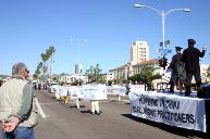 整个游行仿佛都是为我们安排的。那一刻,天地震撼、空气凝结、众生无语。就这样,法轮大法的队伍走过北港大道,在这个美国本土离中国最近的城市里离中国最近的街道上,展示了大法的美好、迫害的残酷无道和大法弟子不屈不挠、和平抗争的精神。