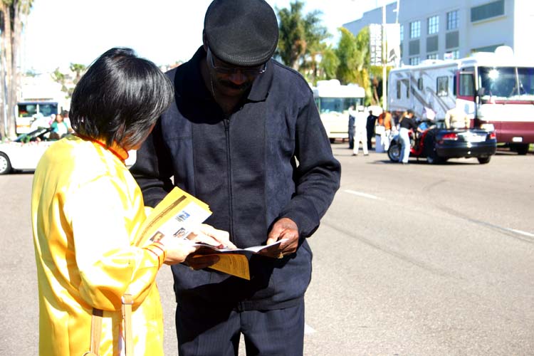 人们纷纷索要传单。人们不解的问:“为什么?”“为什么要迫害这群好人?”“我们怎么才能帮助你们?”一个西班牙语媒体的记者从始至终跟随着我们的队伍,不断拍照并问学员问题,最后表示要学功。一位黑人男士说,这些学员遭到的迫害比黑人历史上遭到的迫害严重无数倍。一个黑人小女孩一直跟在酷刑展车的后面,目不转睛的盯着几组展览。一名观众说,“你们做得对!就应该把邪恶揭露出来。”另一名观众说要帮助我们联系人权团体。