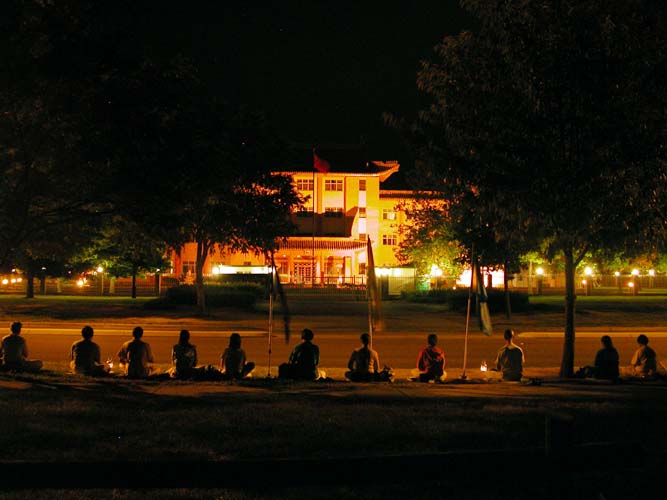 ![]() 2001年6月瑞典哥德堡市中心广场集体炼功 | ![]() 2001年10月法国巴黎埃菲尔铁塔前的集体炼功和烛光守夜 |