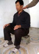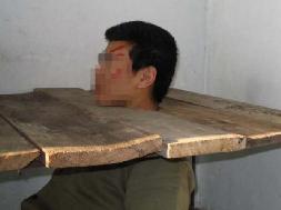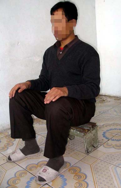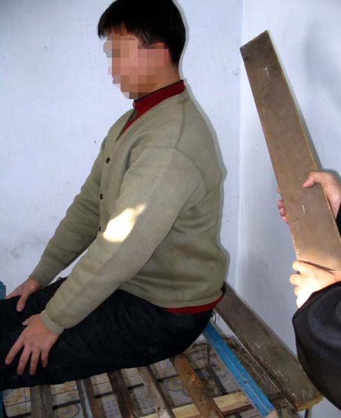 就是坐在一种很小的带楞的凳子上,必须腰直颈正,稍有晃动,就会遭到管号的毒打,经常有不放弃修炼的大法学员的臀部坐烂,露出骨头。每天除了吃饭,大小便外,其余的时间就是伸腿静坐在硬板床上,从早上7点到晚上10点,并且床上不准许铺任何东西,同时还要背诵12号令(监规),限制时间必须会背。如果再不妥协,就改为坐木棍或木板条,用不了两天臀部就坐破了。