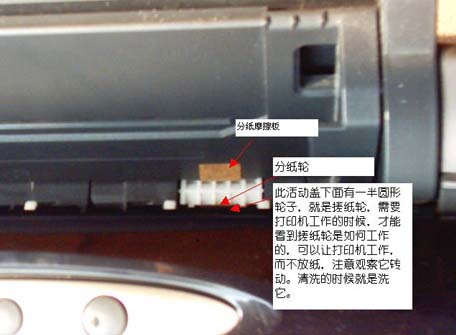 1、 可以先用酒精洗一下(洗搓纸轮的位置如图)。如果其它纸很顺利,只有光滑的彩喷纸或不干胶光盘封面纸有问题,那可以采取把纸先進打印机的那头(就是下面)用手把纸弯一下,就是向上弯一下,可以解决部分问题。