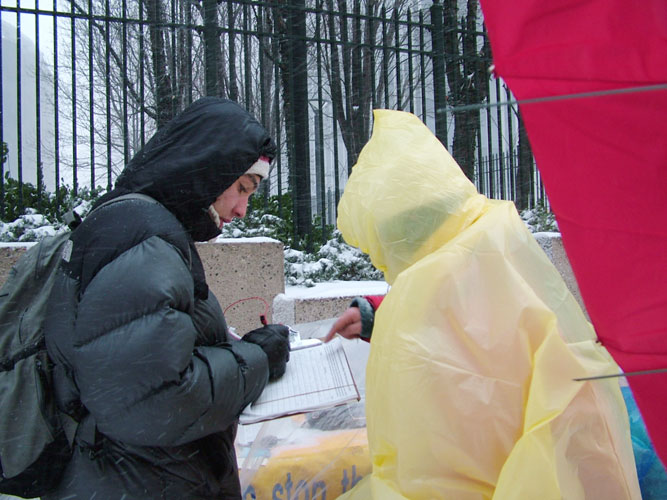 【明慧网2005年1月24日】(明慧记者报道)一场强大的冬季暴风雪星期六(1月22日)袭击美国东北部地区,寒冷的风暴给某些地区带了60公分以上的大雪。寒冷气温在高达每小时97公里的大风吹袭下,使情况变得更加糟糕。星期六这场暴风造成公路交通困难,并使美国东北及中西部地区不得不取消数以百计的航班。大风雪中,来自不同国家的部分法轮功学员依然宁静的来到曼哈顿街头给路人讲真象、办