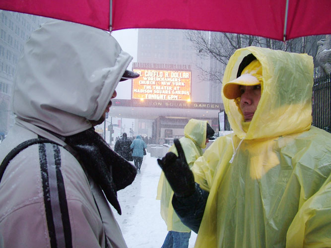 展,使不少纽约人在见证“2005暴风雪”(Blizzard 2005)的同时,也有幸见证了法轮功学员的坚韧和真善忍信仰的力量。