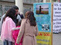 一位中年德国妇女看到法轮功学员的信息台就过来急切的问:“哪位德语讲得好啊?我可是有问题请教。”原来她已经得到了《转法轮》,读书时身体就有反应,还曾到活动中心学了一次功。学员与她交谈并鼓励她继续参加炼功。