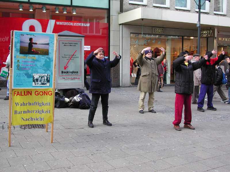 2005年1月22日,星期六,来自远远近近不同城市的约二十名法轮功学员冒着寒冷来到了埃森市中心的商业繁忙区。据明慧网报道,被迫害致死的中国大陆法轮功学员已超过一千三百例,仅十二月份得到的死亡案例就超过五十例以上。为了营救在中国大陆仍然被关押受酷刑折磨的法轮功学员,为了尽快结束这场荒谬、毫无人性的迫害,学员们聚集在这里继续讲真象,呼唤良知与正义的支持。