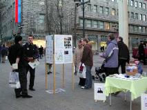到下午五点多天色已呈暮色时,来往的行人还是不少,五六个西人法轮功学员仍坚守在法轮大法真象信息台前,向过往行人介绍法轮功真象。