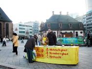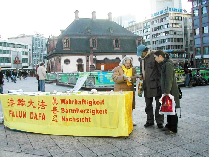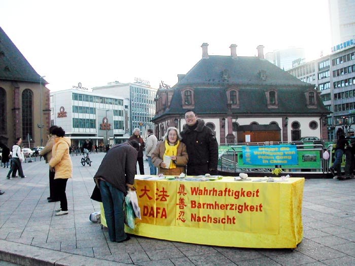 【明慧网2005年1月27日】2005年1月22日,德国法兰克福地区法轮功学员,冒着刺骨的寒风,在德国法兰克福市中心,举行了法轮大法信息日活动,向法兰克福地区的人们洪法讲真象。