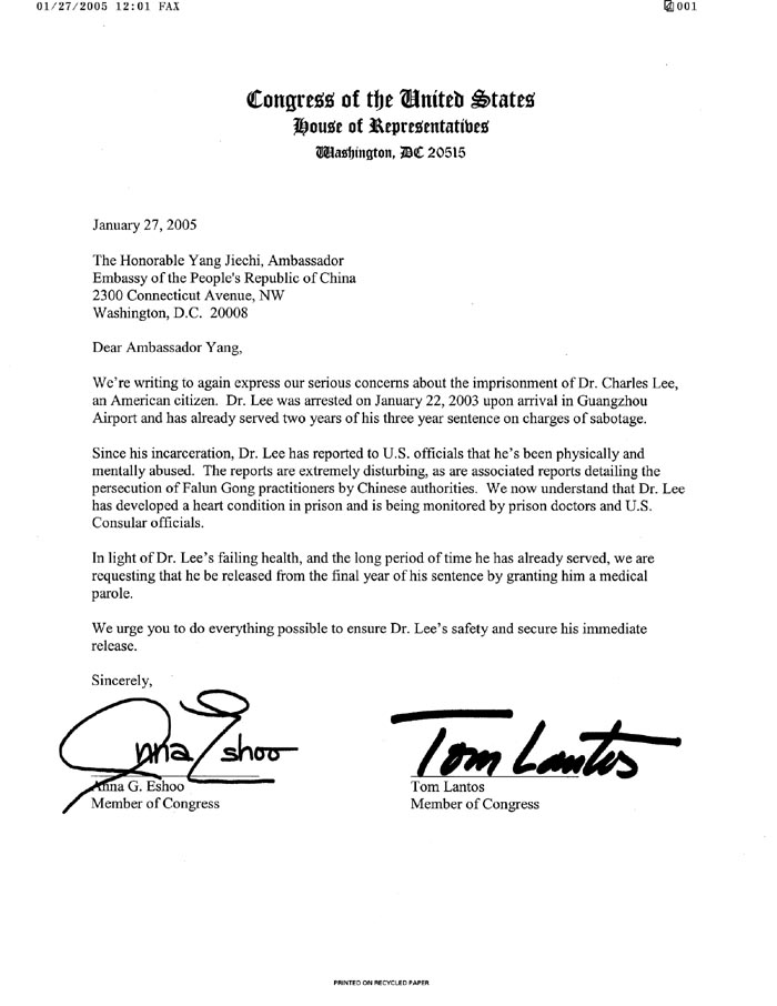 我们再次致函给您,表达我们对监禁美国公民李祥春医生的严重关切。李医生于2003年1月22日在抵达广州机场时遭到逮捕,现已在狱中服刑两年。他被控“破坏罪”遭判刑三年。