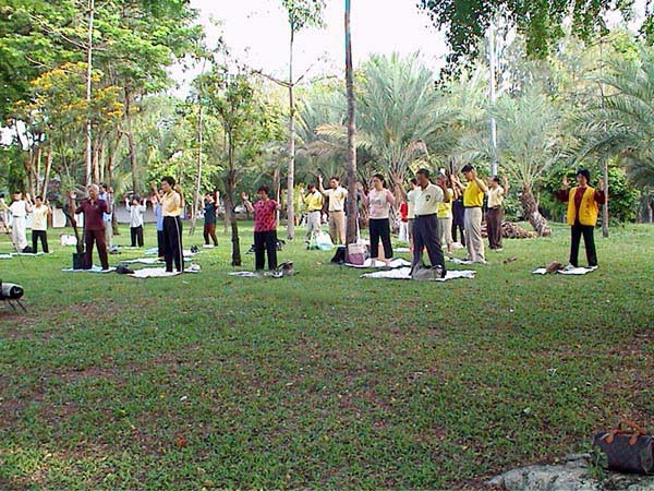 ![]() 泰国学员在曼谷是乐园集体炼功 | ![]() 韩国学员功法展示 |