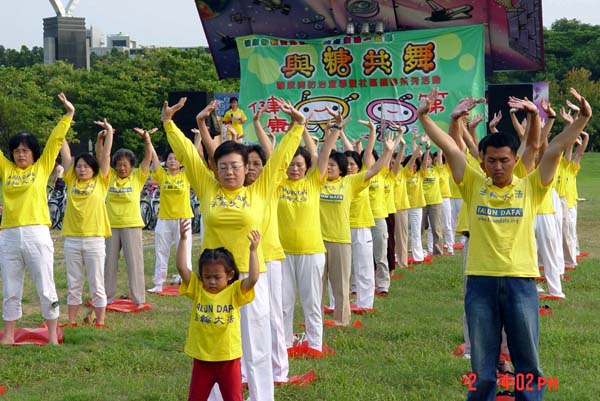 2005年1月1日,十数位宜兰法轮功学员利用元旦假期下午在罗东运动公园炼功洪法。岁末的一股强烈寒流笼罩着原属亚热带的台湾,学员们无惧低温袭身,精神抖擞的炼功与洪法发资料,向民众展示法轮大法“真、善、忍”的祥和美好。平日人潮汹涌的园区,虽因天气因素而游客锐减,学员依旧热情和善的向过往的游客介绍法轮功真象。
