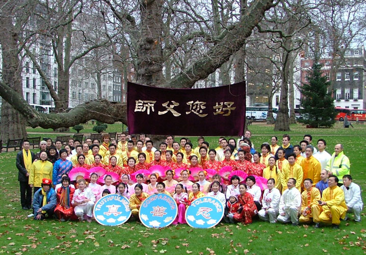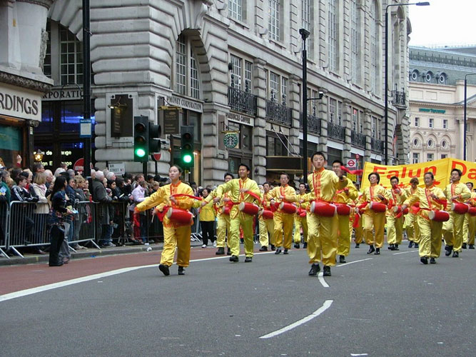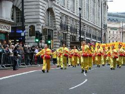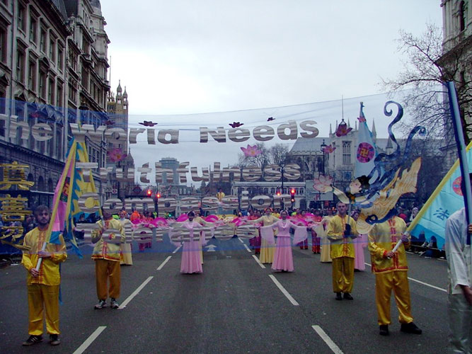【明慧网2005年1月3日】2005年元月1日,伦敦市中心举行了一年一度的新年大游行,来自全球20个国家的1000多名表演者,组成近100个游行团体方阵参加了本次活动。英国法轮功学员组成的表演方阵继去年后,再次作为中国传统艺术的代表参加了规模盛大的游行。游行队伍所经过的伦敦主要街道,万人空巷。50万名观众沿途蔓延数公里。