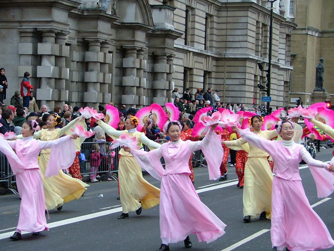 英国法轮大法学员的队伍由几名学员高举各式横幅开道,紧接着的是20名身着华丽的中国服饰的女学员组成的莲花舞及扇子舞表演;在后面的花车上,一朵硕大的莲花上托起一部巨型的《转法轮》模型书,几名学员在车上演示着法轮功功法。花车后面的腰鼓队则在音乐的伴奏下,迈着整齐的步伐,潇洒的舞动着鼓槌,鼓钹声声,传递着“真善忍”的美好祝福。