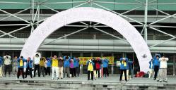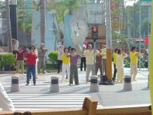 在2005年元旦凌晨四时许,一群居住在桃园的法轮功学员正聚集在桃园巨蛋广场前闭目凝神的炼功,静待着冬日里的第一道晨曦,并准备参加当天在体育馆举行的桃园县全县居民的元旦升旗典礼。