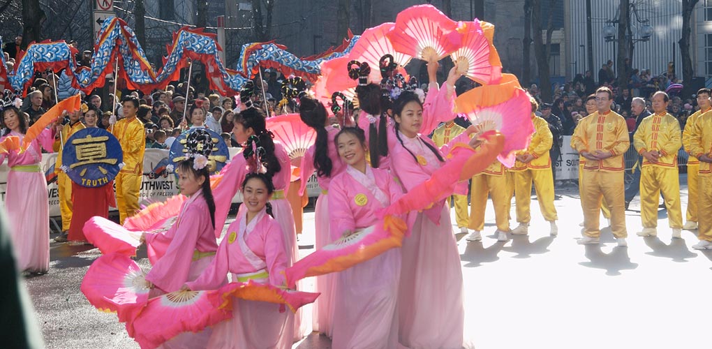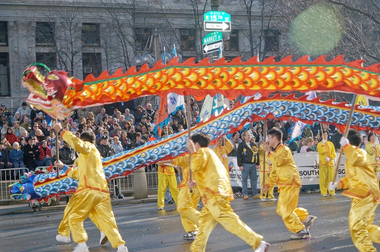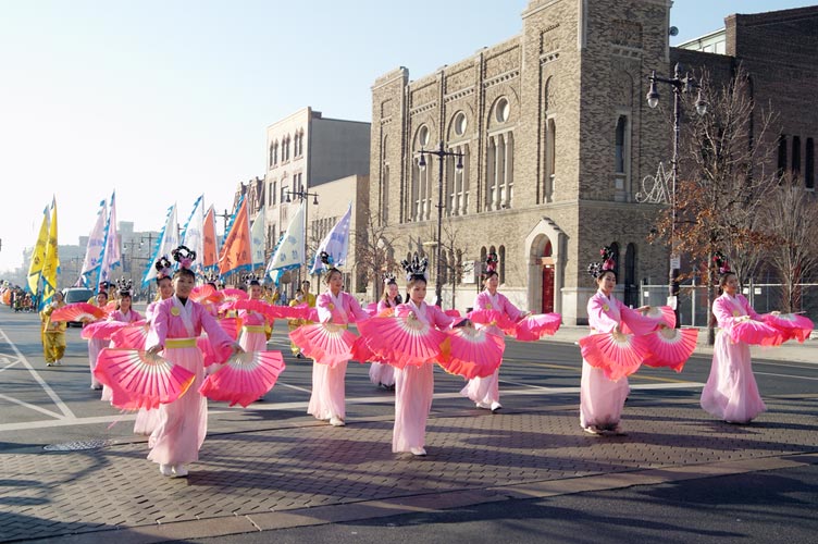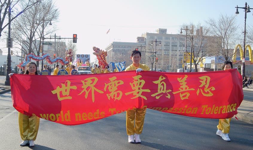 游行队伍从百老街(BROADST)开始,一直延续到费城市政大楼,沿街布满了热烈欢呼的观众。游行中,特别引人瞩目的是以“真善忍”为主题的法轮功学员组成的游行队伍。他们是参加这次游行的唯一的华人团体,法轮功学员表演的舞龙、天女散花、扇子舞和法轮功功法演示,赢得观众热烈的掌声,人们高兴的喊“Bravo!”(太棒了!好极了!),向法轮功学员挥手致意,感谢他们把中国的传统文化和“真善忍”的福音带给西方社会。