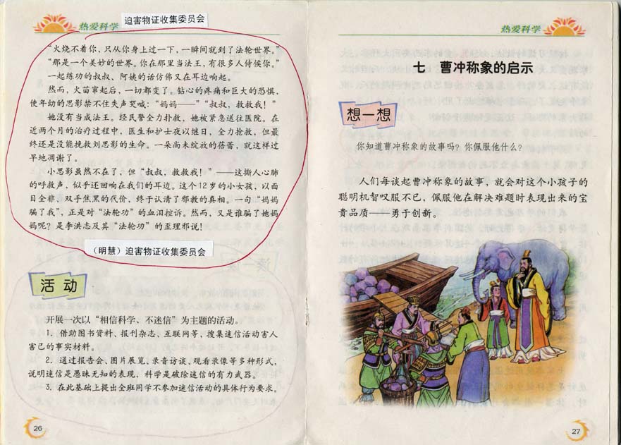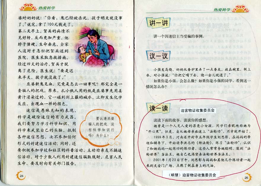 以在大陆从小学念到大学十几年上“政治课”的经历,尽我的想象,最多也就是认为学校把“揭批”当作“时事政治”,印一些攻击法轮功的宣传品,搞搞运动而已。然而我错了,太低估了江泽民、陈至立一伙的邪恶程度。“人民教育出版社”2003年11月第三次印刷的“九年义务教育六年制小学教科书”中的《思想品德》(第十册),十二课中赫然印着的诽谤法轮功的“教学内容”,不但专门假借刘思影之口使大陆小学生落入“天安门自焚”骗局设置的仇恨,而且让所有小学生毫无防备的把诽谤与仇恨法轮功当成“理所当然”和正面思想言行。
