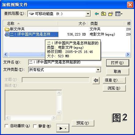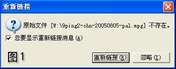 1、安装好软件重新启动后,双击“VCD项目文件”压缩文件中“VCD_之二(上).dwz”,即启动第二评(上)的分拆项目文件(请先下载第二评05.8.28日更新版MPEG文件)。出现(图1)选择“重新链接”,选择您硬盘中的正确文件,文件名不一样没关系,视频时长一样就行。(图2)上面提示是重新链接第二评视频文件,所以双击选择第二评mpeg文件,或选择后点”打开”。