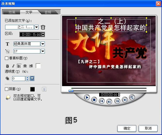 3、如果您要改动裁剪的片段,在相应视频片段点右键,选择“重置编辑主题”,再点“多重修整视频”调整。双击视频片段,或单击选择后再点“改善视频”,可启动(图5)的窗口,选择文字选项卡。通过拖动進度条,可设置从该点开始的文字提示,(图5)上面设置的是开始时有15秒的文字提示。