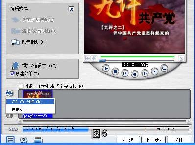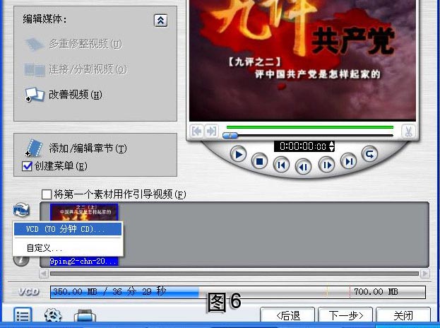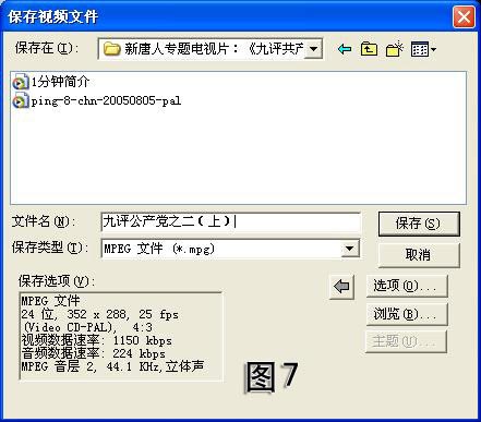 4、下面就可以输出开头有字幕的分拆好的MPEG文件了,如(图6)点视频片段左边的有双箭头环绕胶片的按钮(导出所选的素材),再点“VCD(70分钟CD)”,在打开的(图7)里输入新的文件名如“九评之二(上)”点保存。