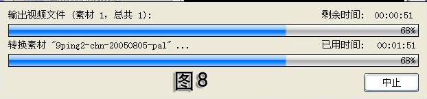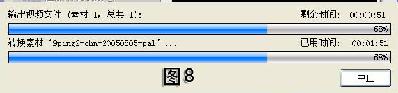 如(图8)两分钟左右就可以输出完成了,这个方法比原文生成的镜像文件中途取消再到临时文件夹了找输出文件的方法快捷多了,而且输出的MPEG文件开头的字幕更清晰。其他的dwz文件的处理方法都相似,把“VCD项目文件”包里的十个文件都处理完之后,就可以用nero刻录刻录成六个VCD盘,加上启动包就行了。(略)