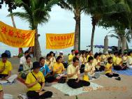 【明慧网2005年10月14日】2005年10月12日,在著名旅游胜地芭提雅的修长海岸,出现了一道由法轮功学员组成的亮丽风景线。六十多名泰国法轮功学员来到这里炼功、讲真象,向人们展现法轮大法的美好。