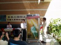 美展的揭幕仪式,是由东华大学财金法律研究所李崇禧教授与中文系罗慧雯教授将一幅名为“坚忍”的画作揭开,并由法轮功学员蔡泰祥为观众们解说这幅画背后的故事:画中的主人翁是中国大陆的学员刘成军,为了帮助人们了解法轮功真象、不再被江氏集团愚弄与蒙蔽,2002年3月,刘成军参与了通过电视插播法轮大法真象影片,并因此遭中共江氏集团残酷迫害,被非法关押遭受长达十八个月惨无人道的酷刑折磨,于2003年9月被迫害致死。画作中呈现的是他虽面临酷刑加身,仍然不放弃对真理的追求,充分体现了修炼者“坚忍不屈的精神”,能以大善大忍的胸怀面对仇恨、摧残,甚至虐杀。