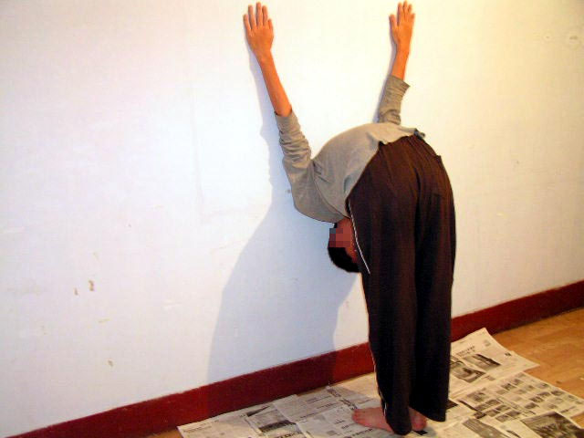 把人四肢分开,斜靠在某物上,作飞机状,长达数小时;