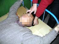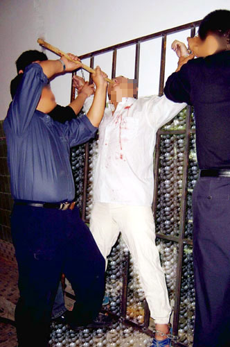 长达数日不让睡觉或不许进食,直到生命的极限;拳打脚踢更是家常便饭;对绝食抗议者,则由彪形大汉野蛮灌食,有的被撬掉牙齿。岔路乡大法学员张真,手指被钉过大头针,身上被烟头烫,被捏过睾丸,坐过角铁,数次被拳打脚踢,神志发呆,精神恍惚。延吉大法学员吴春岩,46岁,满口牙被打掉的一个不剩,吃饭困难,样子象60多岁,而被教唆打人的普教,却因此而“立功受奖”。