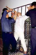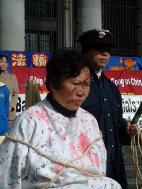 国安对我弟媳妇进行询问,一直到早上都不放她回家。我弟媳妇忍无可忍的冲到了大厅,并强烈抗议警察(国安)无辜拘押的违法行为。此时,我弟弟正好被带到大厅,当时弟媳妇对我弟弟说,国安无辜拘押她并不让她回家。我弟弟对国安说:如果你们不放她回家,我就死在这里。说着就一头撞到水泥地上,当时他满头满脸都是鲜血。[编注]警察被惊呆了,就把他妻子给放了。这时候已经是上午十点多了。
