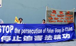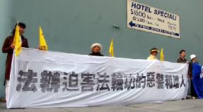 当天,黄华华正带团在旧金山的希尔顿酒店内进行招商活动。湾区的法轮功学员在酒店外打出了“法办迫害法轮功的恶警和坏人”,以及“停止迫害法轮功”的横幅;并在中午时分召开记者会公布起诉黄华华的消息,原告之一周雪菲到场作证。