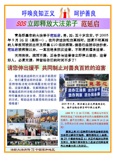 不干胶:立即释放大法弟子范延启(青岛即墨市)