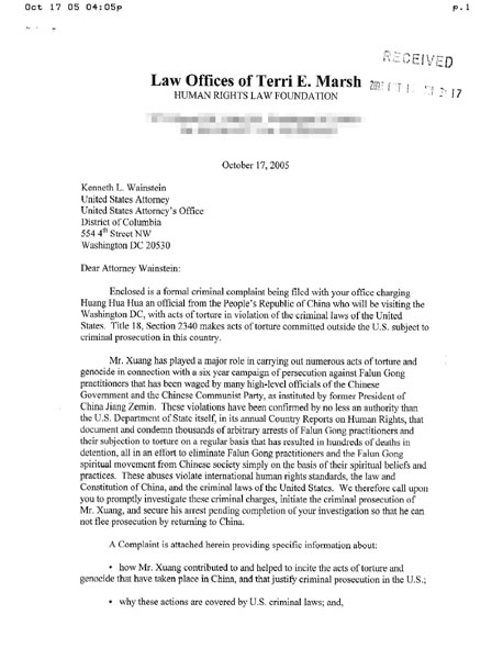在给联邦检察官(US Attorney) Kenneth L. Wainstein 的提告信件首页中,法轮功学员的代理律师说:“由前中国国家主席江泽民发起的,由多名中共政府高官具体实施的对法轮功学员的迫害已达六年之久,黄华华在其中犯下了多起‘酷刑罪’和‘群体灭绝罪’。这些滥用酷刑的罪行违反了国际人权标准法、中国自己的宪章和法律、以及美国的刑事法。因此,我们吁请您立即调查其罪行并启动对黄华华的刑事起诉程序,并且立即将黄华华逮捕,以确保他无法在您调查结束之前返回中国,逃脱罪责。”