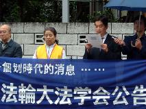 上午11时许开始,学员们冒雨到中使馆对面的人行道,打出要求停止迫害法轮功的横幅,日本法轮大法学会代表卢敏和佐藤国男分别用中、日文宣读法轮大法学会公告,正告那些曾参与中共对法轮功迫害的人,抓紧时机弃恶从善,立即停止迫害,以免在对邪恶的最终审判时,断送自己美好的未来。