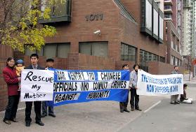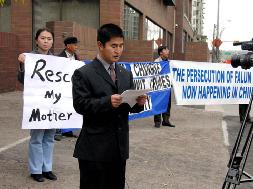 ![]() 法轮功学员在卡尔加里中领馆前举行新闻发布会 | ![]() 段凯文在新闻发布会上,陈述母亲被绑架的经过。 |
