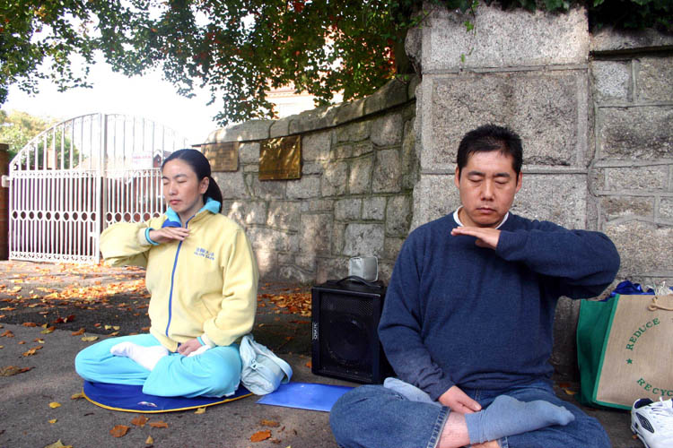 【明慧网2005年10月19日】2005年10月17日,法轮功学员在中国驻爱尔兰使馆前,宣读了《法轮大法学会公告》。同时打出了“法办江泽民,罗干,刘京,周永康”的横幅;呼吁那些依然参与或协助中共、参与迫害法轮功的中共官员或个人,早日醒悟,停止迫害。