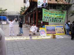 法轮功学员们还在酒店前面举行记者会,宣布美国法轮功佛学会和在广东遭受迫害的法轮功学员周雪菲,以酷刑罪对黄华华提出刑事诉讼的消息。