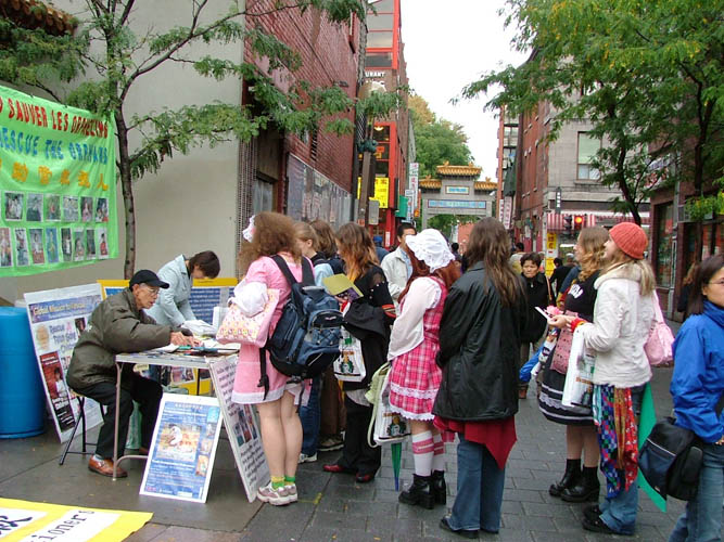 【明慧网2005年10月19日】2005年10月15日、16日,蒙特利尔法轮功学员在唐人街中山公园,为即将于10月25日至11月12日举行的“真善忍”美展進行首次大型推广活动。